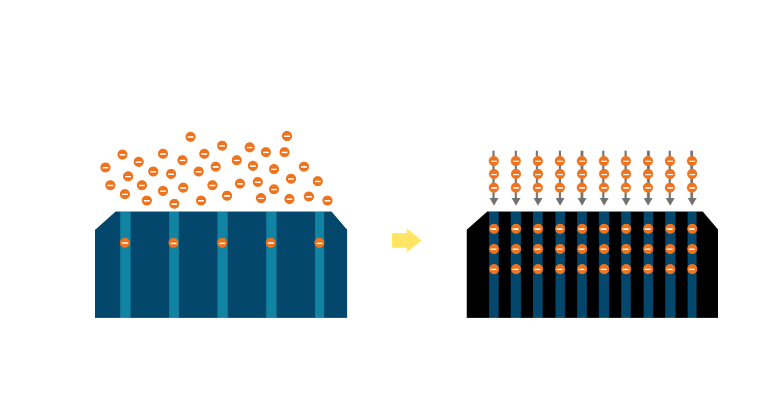 - 電池使用多條銅導線 (Copper wire) 於電池片上形成較短的電流路徑,提高電流收集效率,採用圓形設計的銅導線較傳統扁平式的銅焊帶 (Ribbon),可增加入射至電池的光線量。